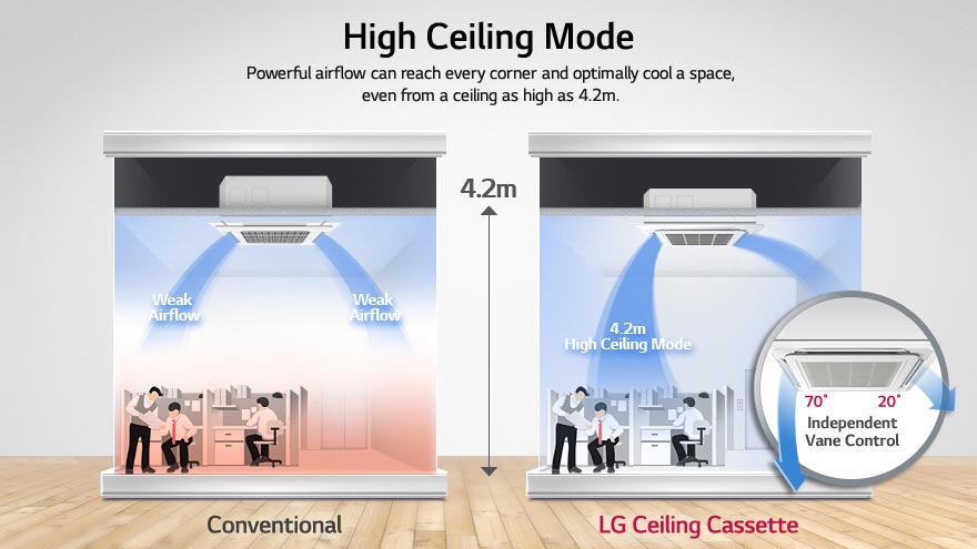 Create an environment that's stylish and comfortable. LG cassette air conditioners offer powerful cooling and a streamlined design, so you can cool your office, boutique, café or hotel without disrupting your space.